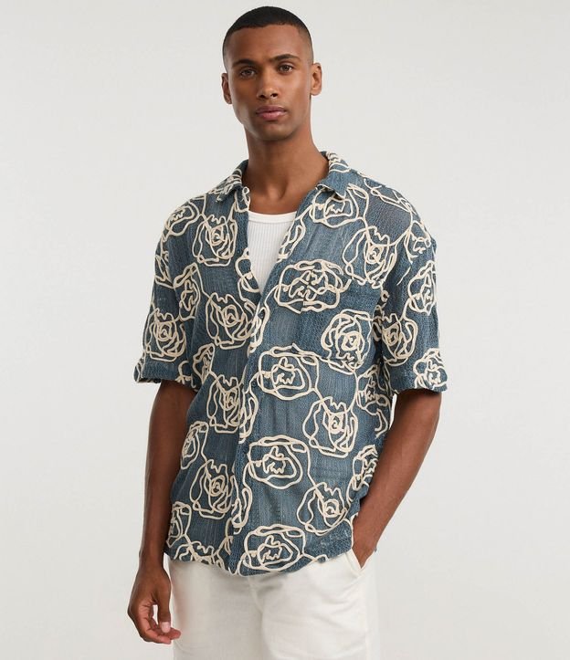 Camisa masculina confeccionada em tricô mais sustentável com boas práticas ambientais, possui gola colarinho, manga curta, abotoamento frontal, com Textura floral.