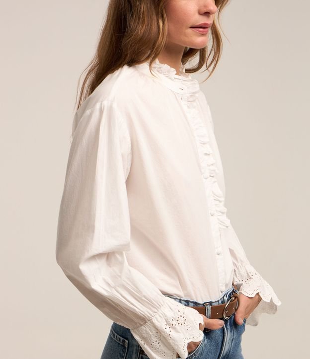 Camisa em Tricoline com Detalhes de Babados e Abotoamento Frontal