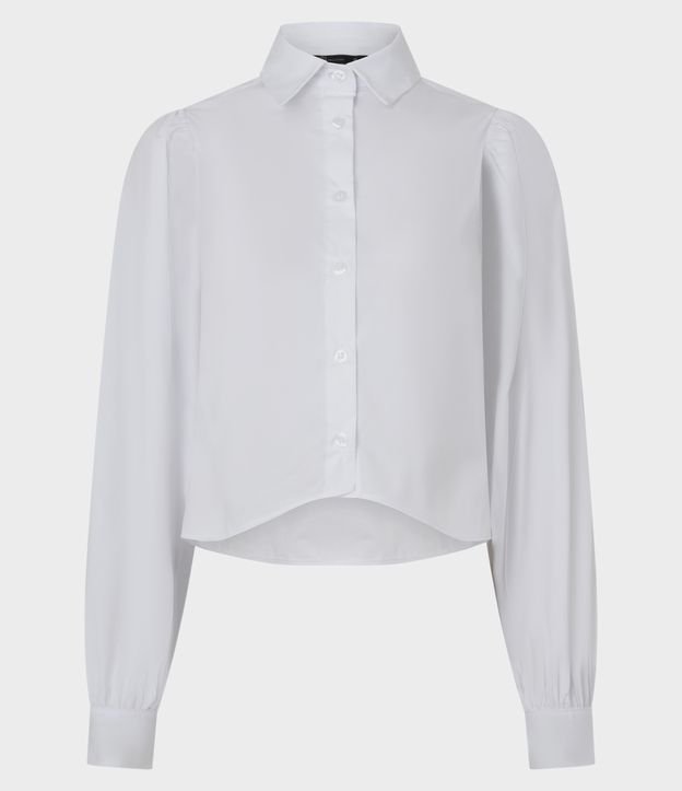 Camisa curta em tricoline, com manga longa bufante e punhos ajustados. Possui gola tradicional, abotoamento frontal e barra levemente arredondada.