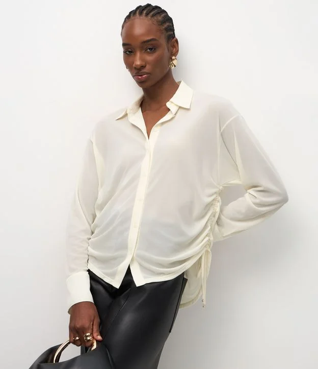 Camisa em Tule com Transparência e Puxadinho Lateral Branco