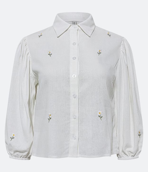 Camisa em Viscose Manga 3/4 Bufante e Bordado de Mini Margaridas Branco