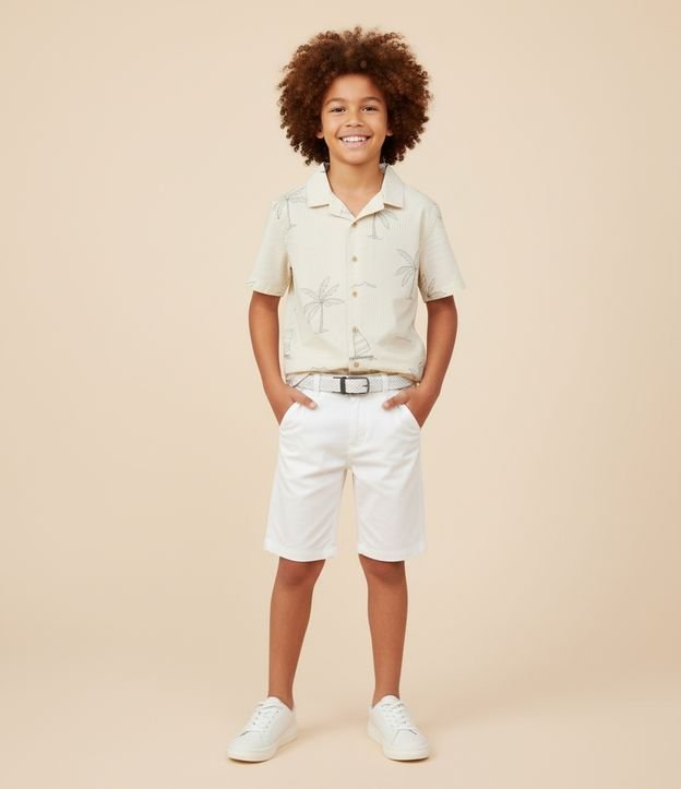 Camisa infantil confeccionada em algodão com estampa de coqueiros e barcos, trazendo leveza e estilo para os dias quentes. Possui gola tradicional, mangas curtas e fechamento por botões frontais. Confeccionado em algodão certificado BCI e boas práticas ambientais, garantindo conforto e sustentabilidade.