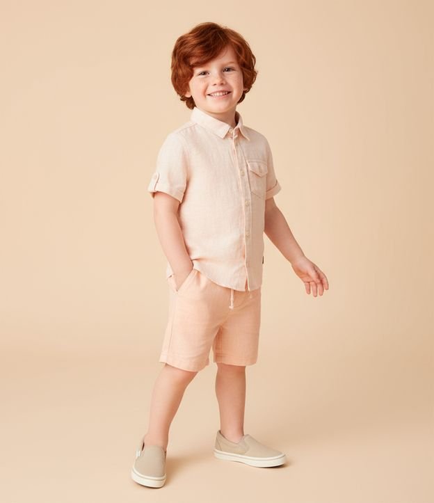 Camisa infantil confeccionada em linho e viscose, gola colarinho, manga curta com ajuste e abotoamento frontal. Peça com bolsinho com lapela.