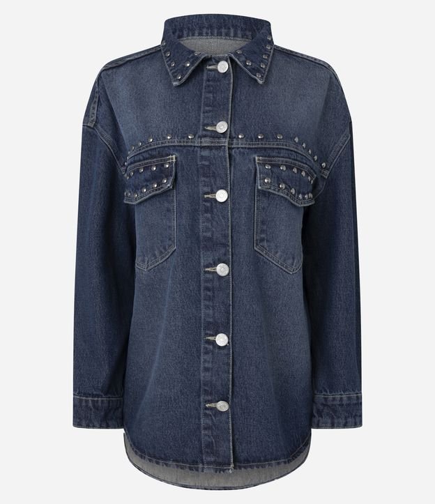 Camisa Jeans Overshirt Com Tachas Azul Escuro