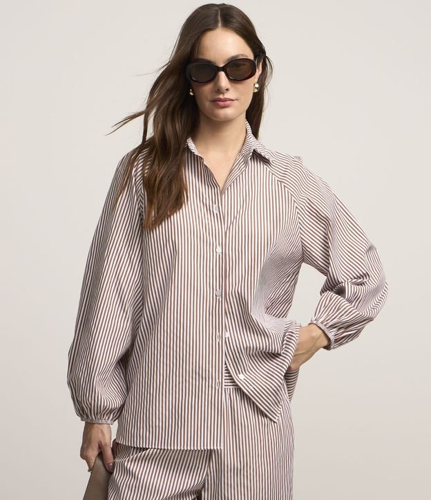 Camisa Listrado em Tricoline com Cava Raglan Marrom/Branco