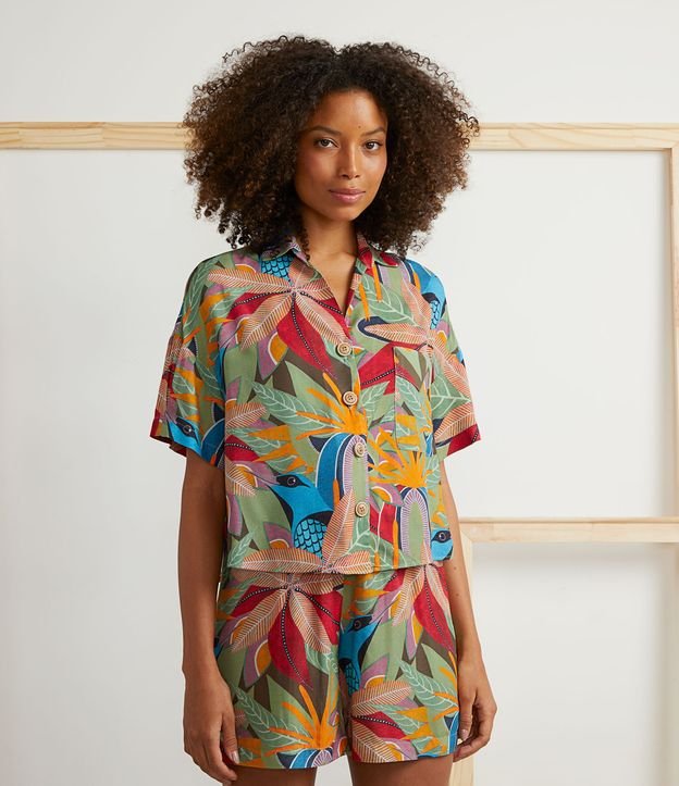 Camisa Manga Curta em Viscose com Estampa de Folhagem