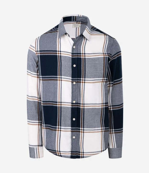 Camisa masculina confeccionada em flanela mais sustentável, gola colarinho, abotoamento frontal e manga longa. Peça com estampa xadrez.