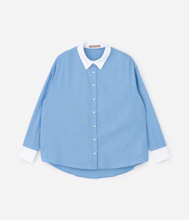 Camisa Manga Longa Listrada com Gola e Punhos Contrastantes Curve & Plus Size Azul