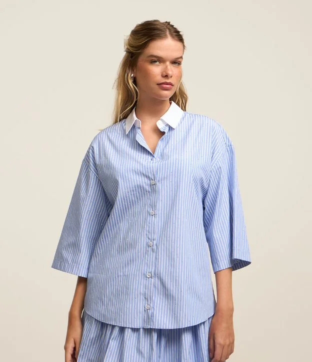 Camisa feminina de modelo oversized, confeccionada em tricoline, com gola colarinho contrastante, mangas curtas, fechamento por botões e aplicação de hotfix por toda a peça.