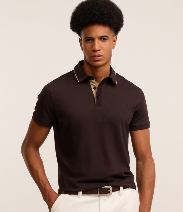 Camisa Polo Regular em Algodão Peruano com Detalhe Contrastante na Gola Marrom escuro