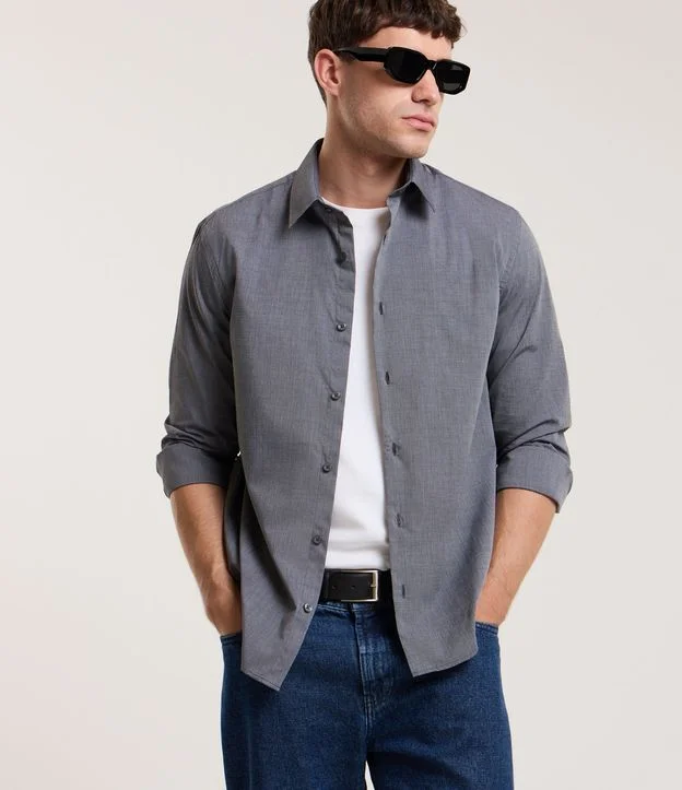 Camisa regular masculina, confeccionada em algodão mais sustentável, com gola colarinho, mangas longas, abotoamento frontal e sem estampa.