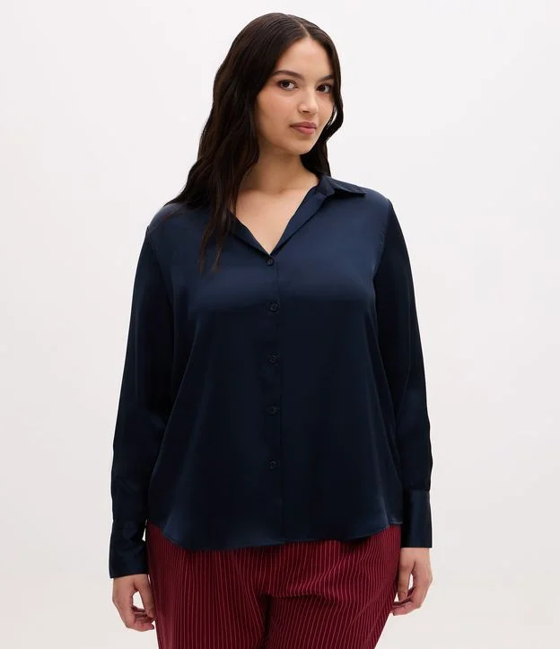 Camisa Regular em Cetim com Vista de Botões Azul Marinho