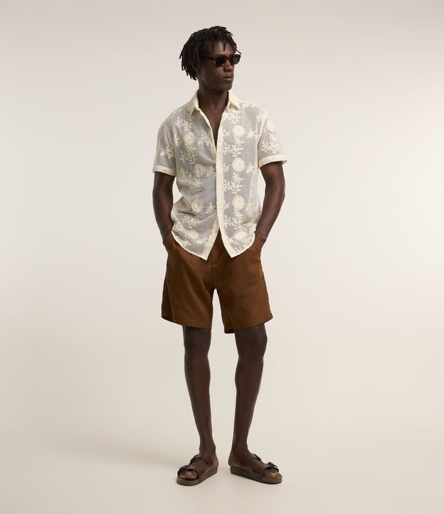 Camisa masculina confeccionada em tricô, gola com colarinho, abotoamento frontal, manga curta. Peça transparente no modelo regular com textura e bordado floral.