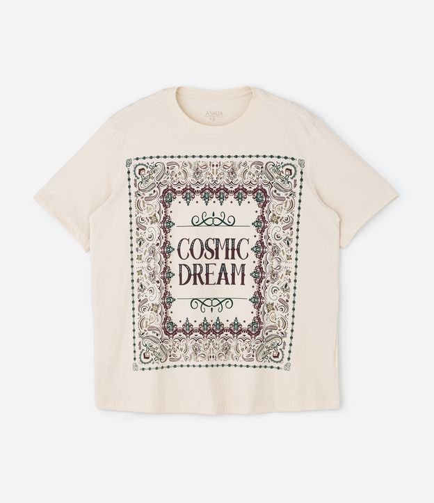 Camiseta Curve & Plus Size feminina confeccionada em algodão certificado mais sustentável. Possui modelo regular alongada, mangas curtas, gola redonda e estampa cosmic dream.