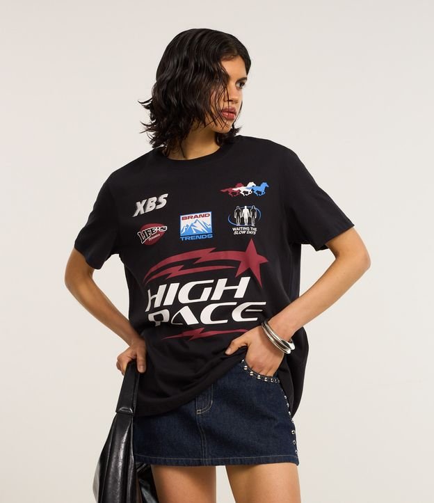 Camiseta Alongada em Algodão com Estampa Frente e Costas High Pace Preto
