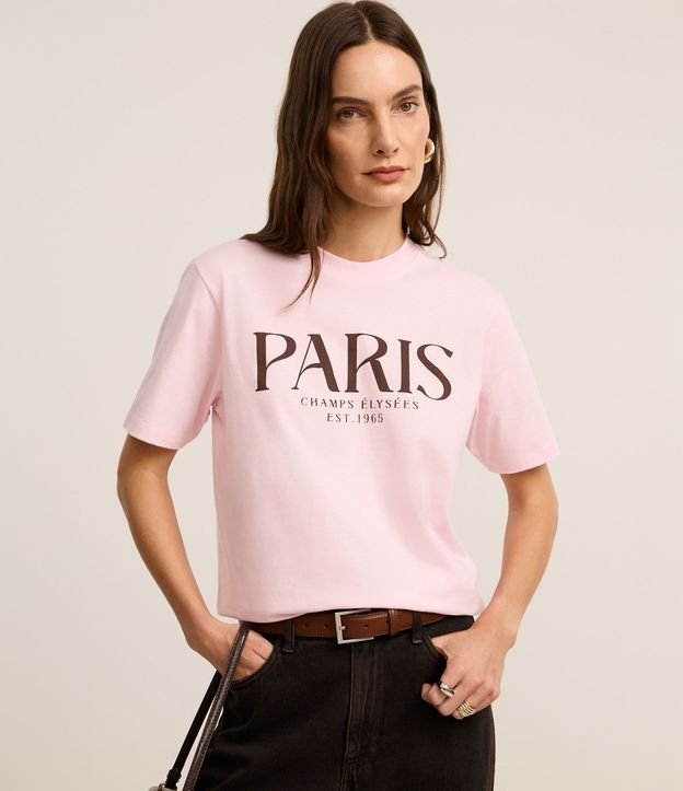 Camiseta Alongada em Algodão com Estampa Paris Rosa