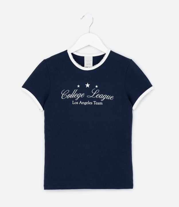 Camiseta Baby Look com Estampa Lettering College League Azul Marinho