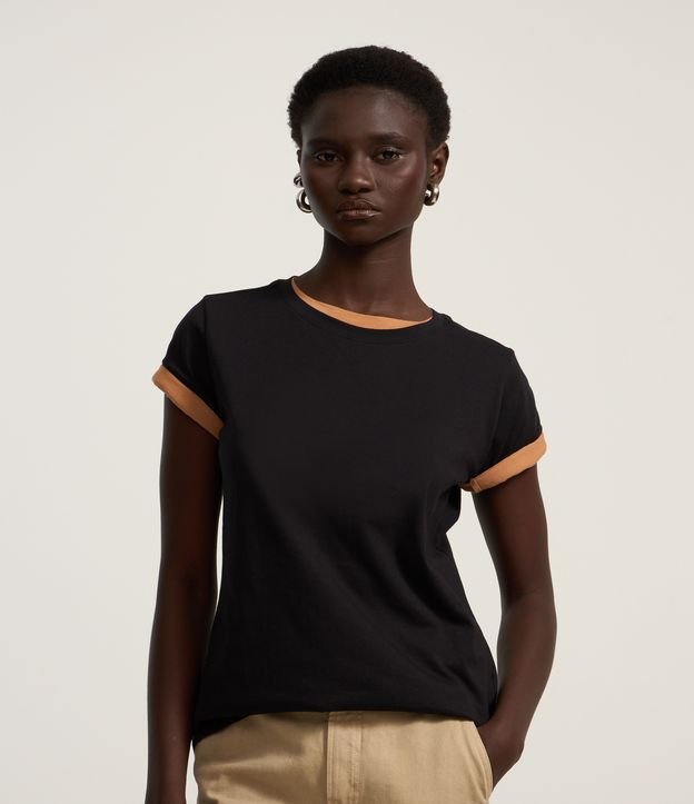 Camiseta básica feminina, confeccionada em algodão, com gola redonda e mangas curtas.