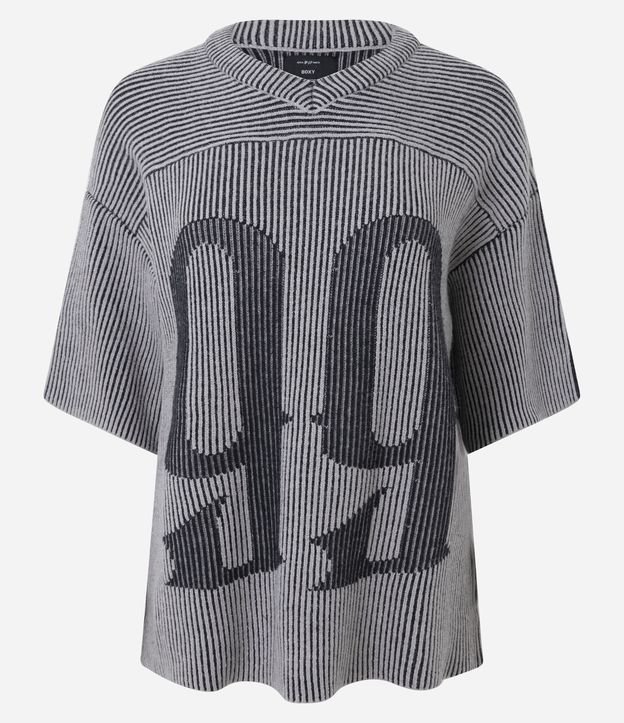 Camiseta Boxy em Tricô Leve com Listras e Estampa Número 99 Cinza Mescla