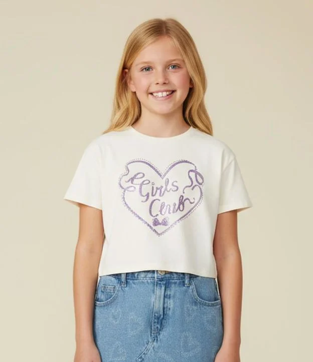Camiseta Boxy Infantil com Aplicação de Strass Girls Club - Tam 5 a 14 Anos