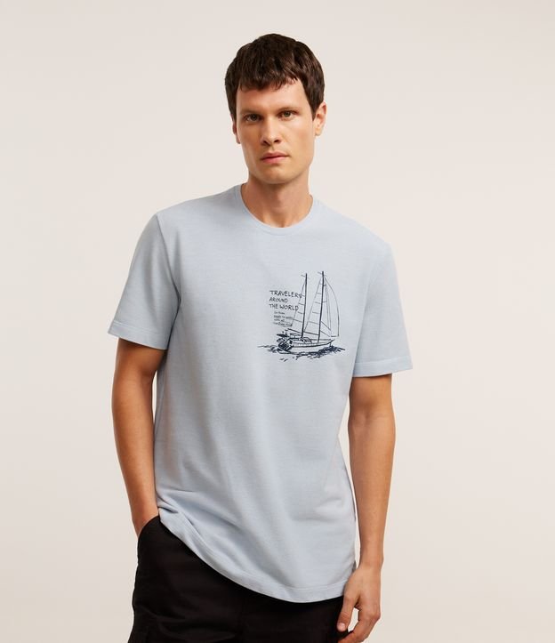 Camiseta Comfort em Algodão com Estampa de Barco e Lettering Azul