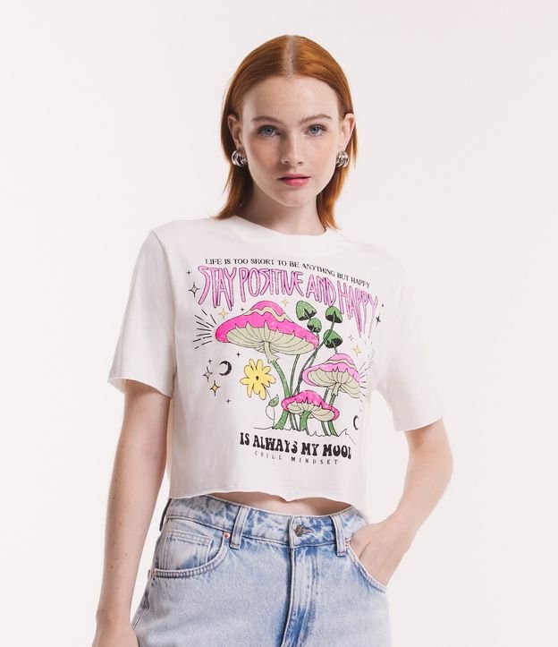 Camiseta Cropped em Meia Malha com Estampa Cogumelos