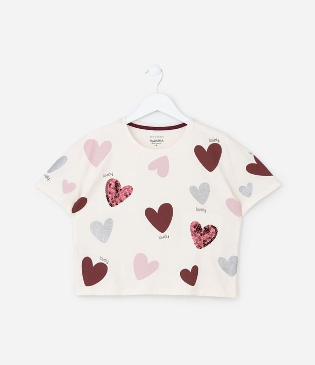 Camiseta Curta Infantil com Bordado Coração em Paetês - Tam 5 a 14 Anos