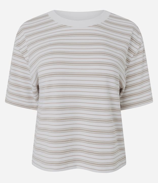 Camiseta de pijama confeccionada em viscolycra mais sustentável, no modelo regular. Possui gola redonda, manga curta e estampa de listras.
