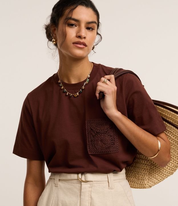 Camiseta em Algodão com Bolso de Efeito Crochê Marrom