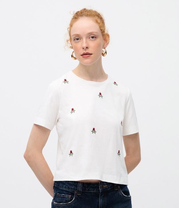 Camiseta em Algodão com Bordados de Florzinhas Branco