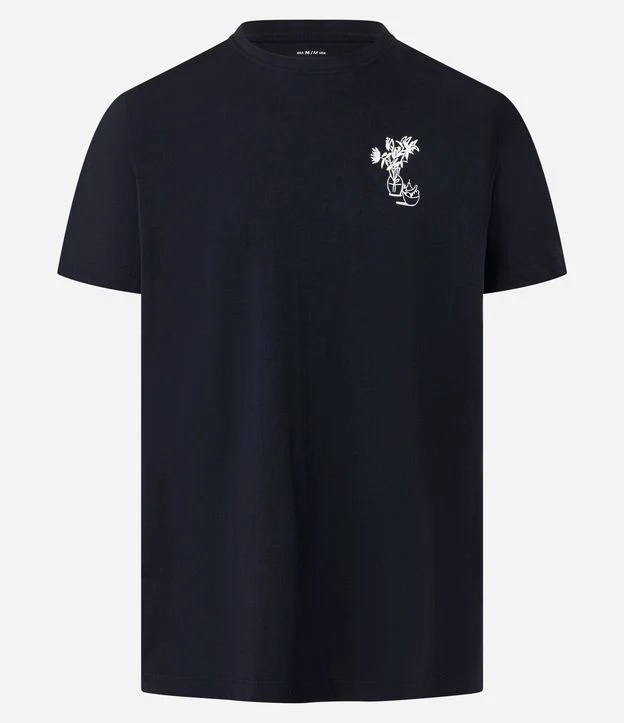 Camiseta masculina confeccionada em algodão mais sustentável com melhores práticas ambientais. Peça com gola redonda, manga curta e estampa de vila histórica.