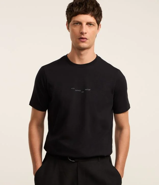 Camiseta em Algodão com Estampa Who Controls our Reality Preto