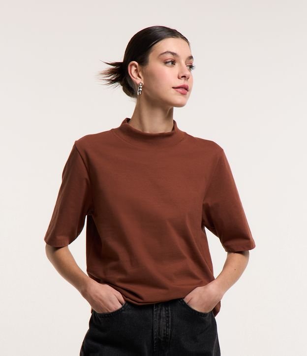 Camiseta em Algodão com Golinha Alta e Manga Curta Marrom