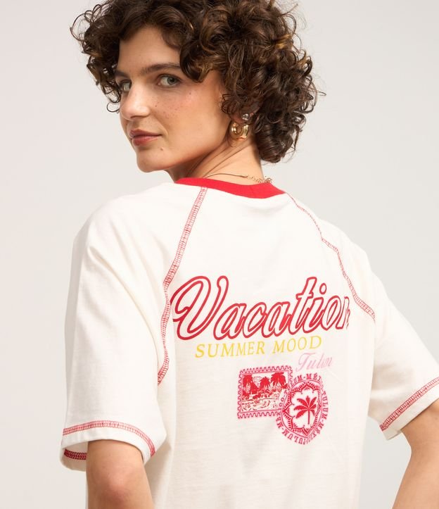Camiseta feminina, confeccionada em malha de algodão, com detalhes contrastantes na gola e mangas, estampa "vacation" e visual com estilo retrô.
