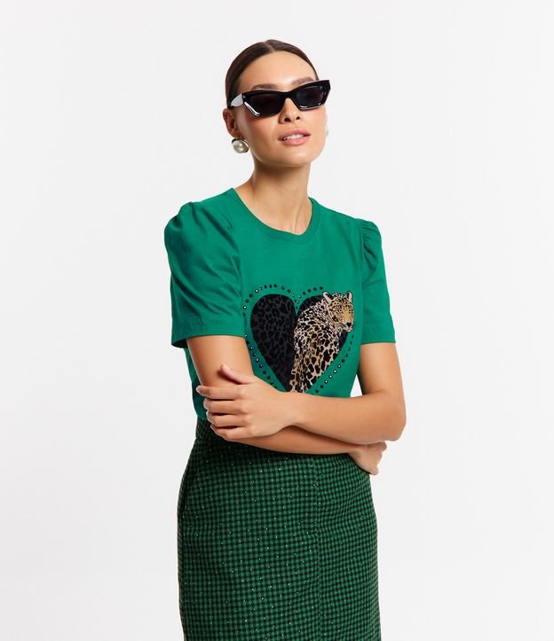 Camiseta em Meia Malha com Manga Bufante e Estampa Onça em Coração Verde