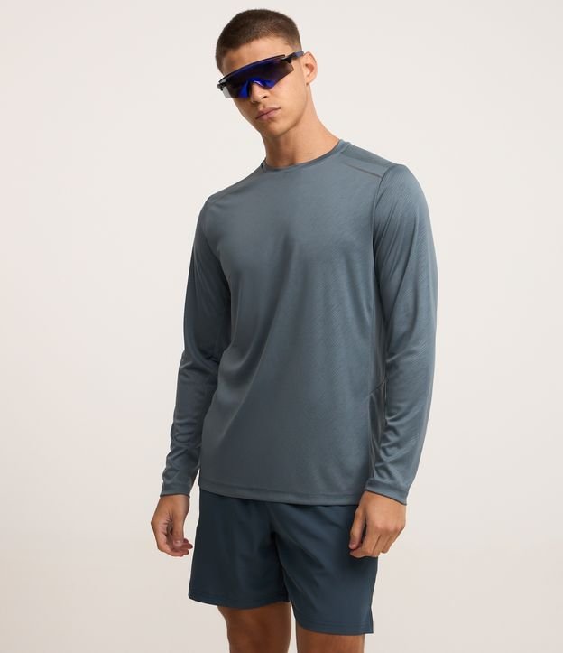 Camiseta masculina esportiva, com gola redonda e mangas longas. Possui estampa riscada e detalhes refletivos. Peça confeccionada com maior tecnologia e proteção uv.