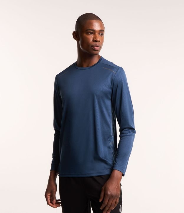 Camiseta masculina esportiva, com gola redonda e mangas longas. Possui estampa riscada e detalhes refletivos. Peça confeccionada com maior tecnologia e proteção uv.