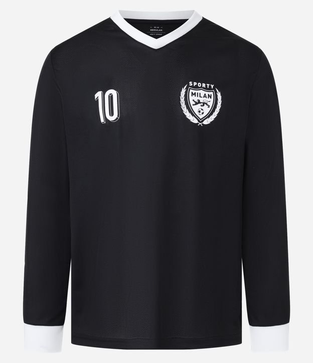Camiseta masculina confeccionada em tecnologia dry, com gola em v, manga longa e barra contrastantes. Peça no modelo esportiva de futebol com estampa lettering e brasão localizado.