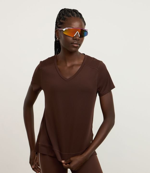 Camiseta Esportiva em Microfibra Furadinha com Barra Mullet Marrom