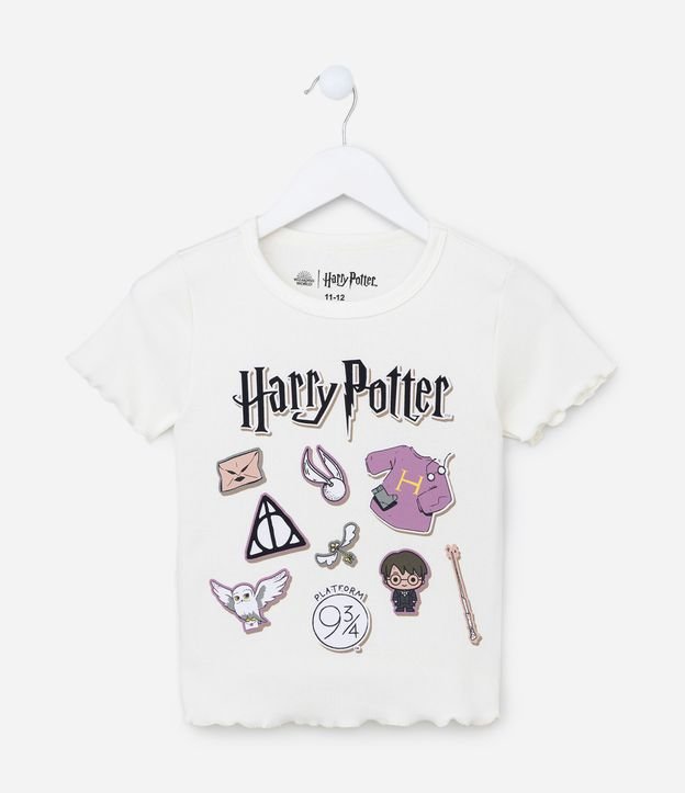 Camiseta infantil canelada, com gola redonda, mangas curtas e estampa do Harry Potter. Possui frufru nas bordas.