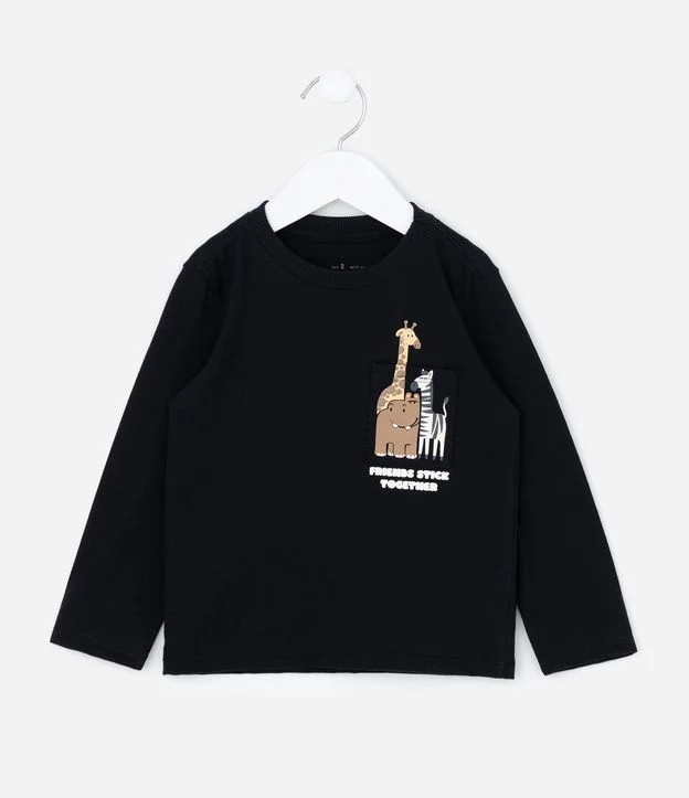 Camiseta Infantil com Bolsinho e Estampa Animal – Tam 1 a 6 Anos Preto