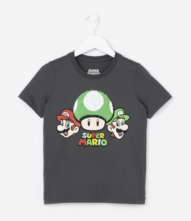 Camiseta infantil confeccionada em algodão, com mangas curtas e gola redonda. Possui bordado em paetê que vira do Super Mario.