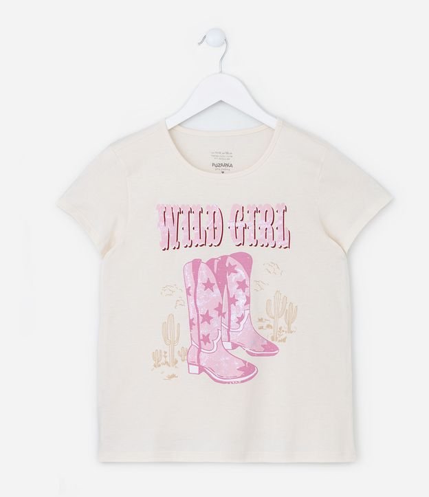Camiseta infantil confeccionada em algodão, com gola redonda, mangas curtas e estampa de botinha couwboy com lettering "Wild girl".