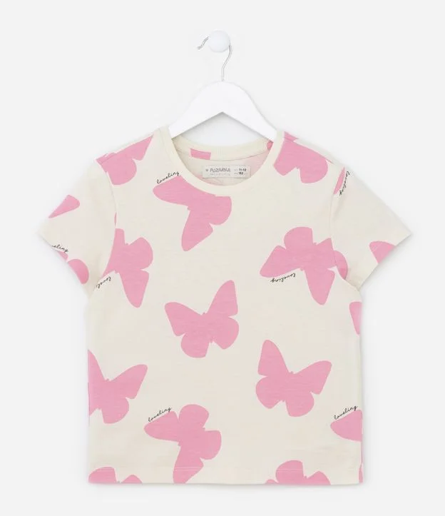 Camiseta Infantil com Estampa de Borboletas - Tam 5 a 14 Anos Bege