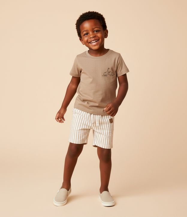Camiseta infantil confeccionada em algodão certificado BCI e boas práticas ambientais, oferecendo toque macio e conforto. Possui gola redonda, mangas curtas e estampa de dinossauros no peito, trazendo um visual divertido.