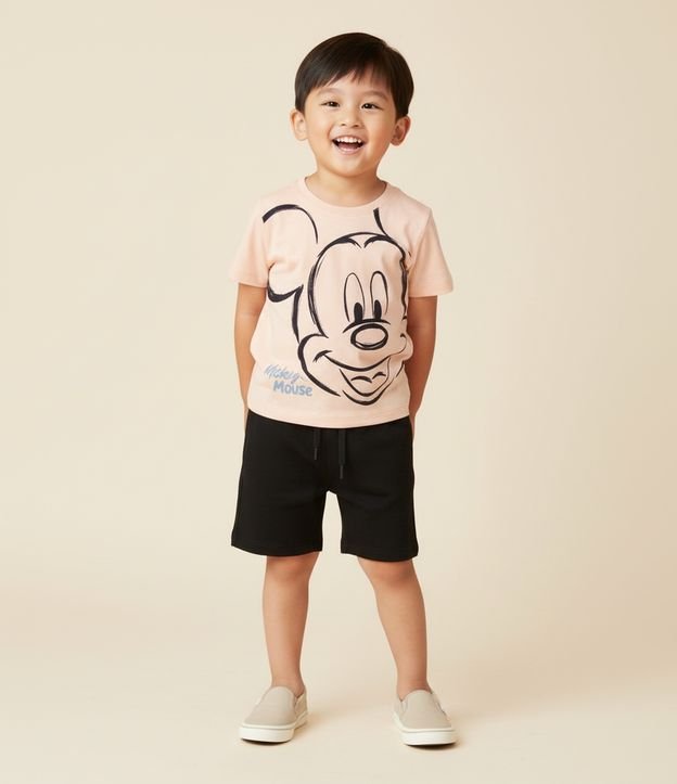 Camiseta infantil com mangas curtas, gola redonda e estampa do Mickey.