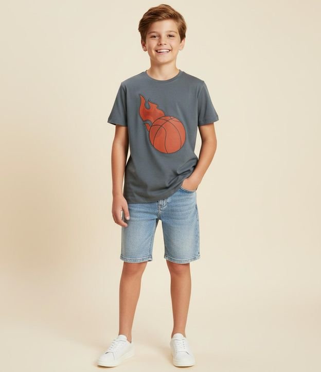 Camiseta Infantil com Estampa em Relevo Bola de Basquete - Tam 5 a 14 Anos Cinza