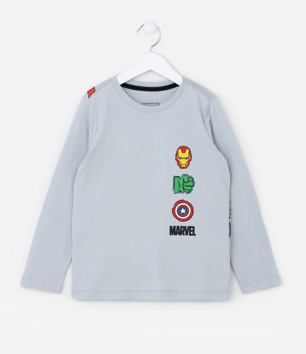 Camiseta infantil confeccionada em algodão mais sustentável, com gola redonda, manga longa e estampa frente e costas dos Avengers.