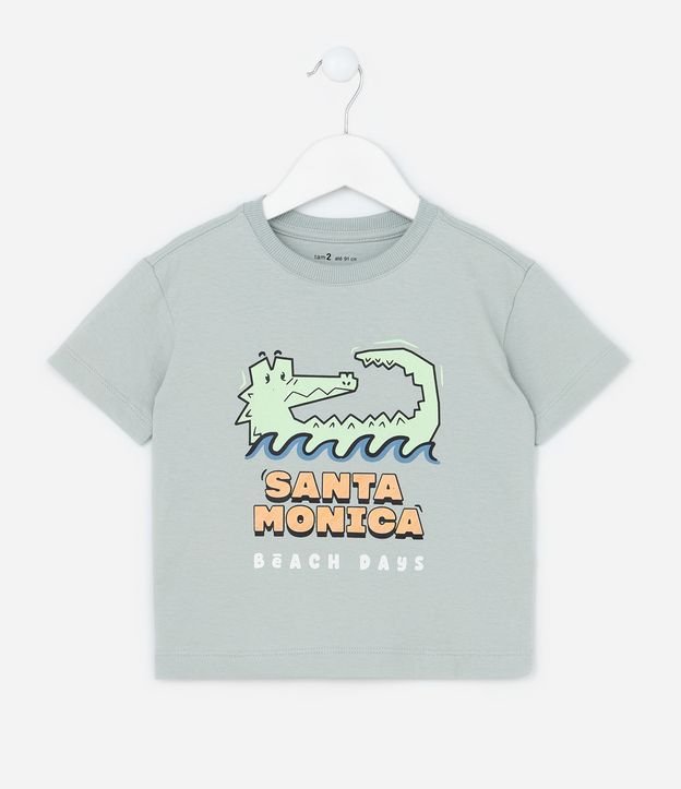 Camiseta infantil confeccionada em algodão de material mais sustentável. Possui gola redonda, mangas curtas e estampa de jacaré com lettering "Santa Monica".