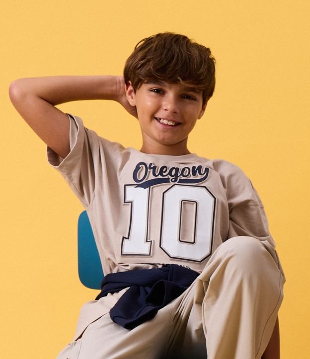 Camiseta Infantil com Estampa Lettering Oregon 10 – Tam 5 a 14 Anos Bege Claro